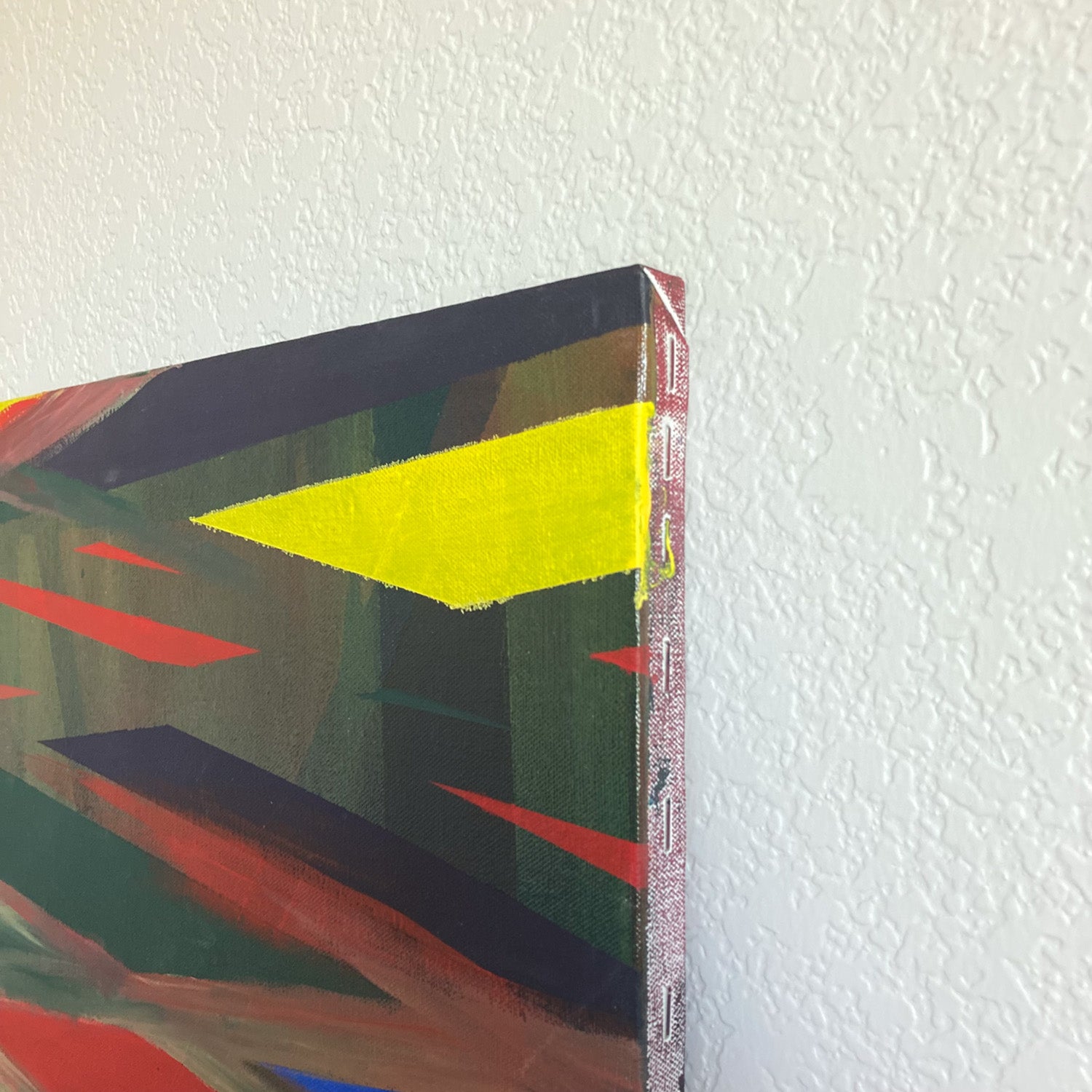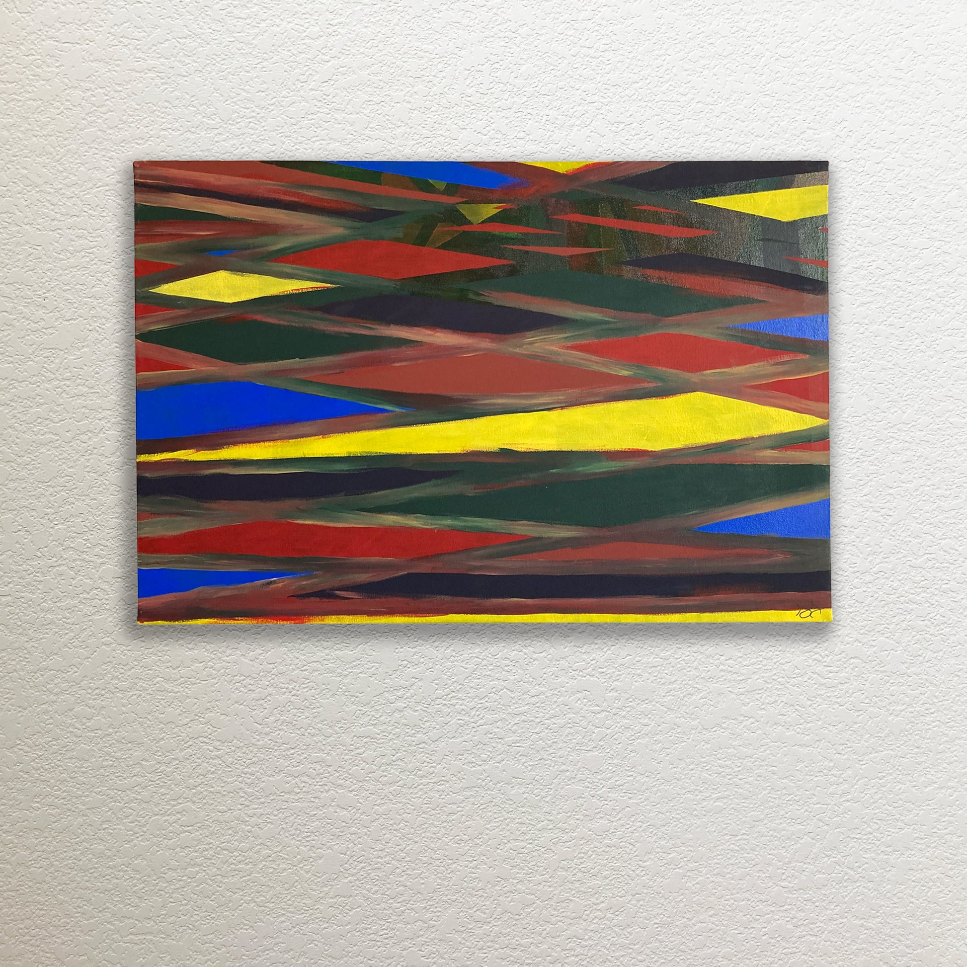 Elevate your space with Cross River, an exquisitely painted medium abstract painting by Sandie Marie. Bursting with bright yellow, deep burgundy, and pops of blue, this piece captivates with its dynamic abstract movement and textured brushstrokes. Its size allows for versatile placement in any room.